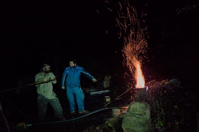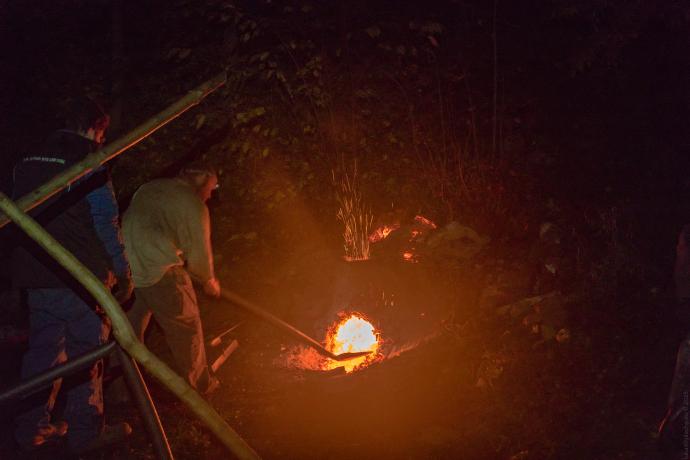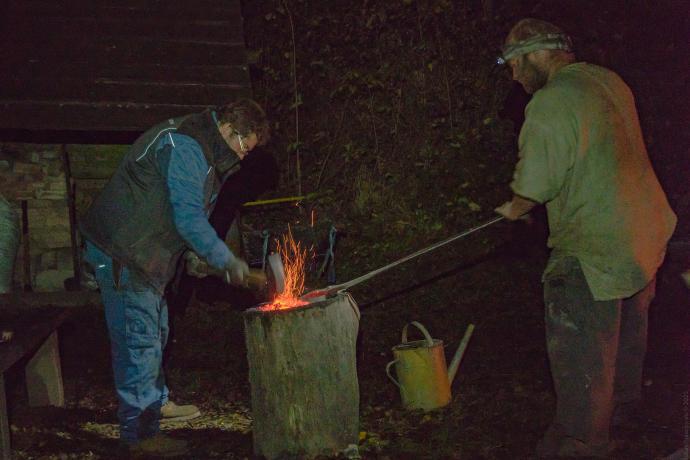 Ve středu 15.10.2025 vydatně pršelo, a tak se toho nedalo udělat moc. Odpoledne jsme alespoň nadrtili skarn z Vlastějovic nad Sázavou (v roli potentní struskotvorné přísady) a albánskou rudu (ač nevypraženou) pro pokusnou tavbu v následující den. Experiment poskytl ohromný kulovitý útvar, o němž jsme si zprvu mysleli, že jde o masivní superhustou houbu. Končili jsme vždy až za tmy, kdy s rozžhaveným kusem nelze ještě příliš manipulovat a už vůbec ne jej posuzovat. Ráno poté se bohužel ukázalo, že navzdory pozitivnímu vlivu skarnové hlušiny z Vlastějovic nad Sázavou v obsahu 25 wt%, jenž zajišťuje, že se při užítí dané rudy nezalepuje dyzna, byla získána koule spíše vysoce kovnaté strusky prostoupené drobnými částicemi železa.
