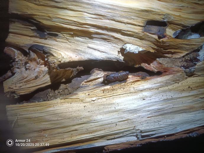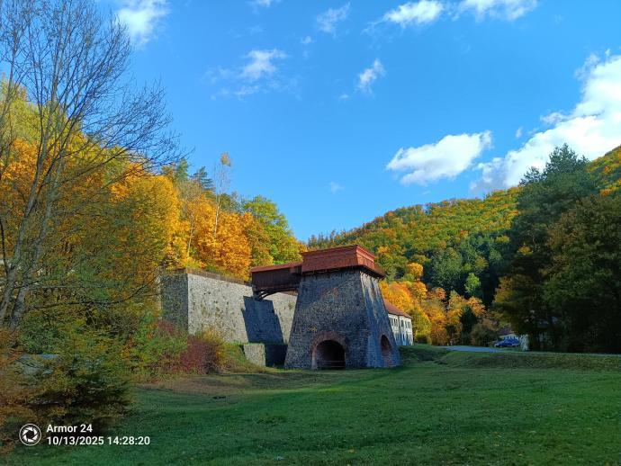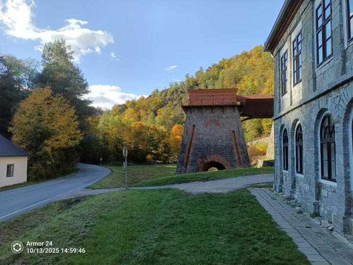 V závěrečnou sobotu dne 25.10.2025, kdy znovu dorazil Petr Appel po třídenní absenci aby se konečně pořádně vykurýroval, jsme se zabývali stahováním fotek a časosběrů, pořízených během celé akce. Rovněž jsme se zašli podívat do svahu za Kameňákem, v němž v určitém místě vystupuje na povrch vrstva ‚bazálních klastik‘, zde takového šedorůžového pískovce na rozhraní mezi brněnskou vyvřelinou a devonskými vápenci. Důvodem průzkumu bylo určit, zdali se v ní náhodou též nevyskytují minerály mědi, jako je tomu v nižších partiích dané vrstvy, zasypaných materiálem po opravě sesuté sekce zdi rampy pod údolíčkem vlevo od pece Františka v 60. letech. Naštěstí je tato zajímavost, tedy výskyt mědi v areálu sloužícím pro zpracování rudy železné na patřičný kov, viditelná alespoň coby jeden kus zabetonovaný v zídce zhruba naproti vstupu do Muzea, na němž lze spatřit krustu zeleného malachitu.