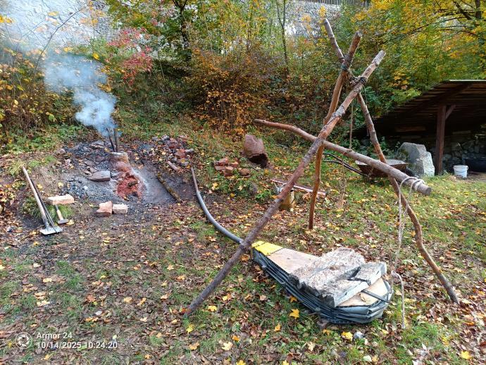 Kvůli rozebírání milíře proběhla (po nedělnímu odjezdu ZrMartina) další a poslední tavba až v úterý 21.10.2025, kdy jsem ověřoval teorii, zdali vskutku za peripetie s rakouskou rudou může přítomnost ankeritu. Pečlivě jsem vybíral kousky složené pouze z hrubě krystalického sideritu. To bylo svízelné, neb moc hrubých nenadrcených kusů rudniny již nezbývalo. Leže na břichu jsem ‚vyzobal‘ a roztloukl dostatek materiálu pro tavbu opět 15 kg směsi přebraného sideritu s 10 wt% patřičného písku. Tentokrát, ačkoliv se struska opět soplila (ale méně), vznikla velmi hustá a kompaktní hlavní houba o hmotnosti 3,25 kg, jenž s druhým menším kusem celkově vážila 3,74 kg, což už by se dalo prohlásit za úspěch. Žhavé uhlíky z tavby jsme použili pro zapálení hranice, v níž byla obsažena bohatá magnetitová ruda ze Slovenska (ale nevím odkud, pouze to, že ji slovenští kolegové nasbírali na lesní cestě po mohutných deštích).