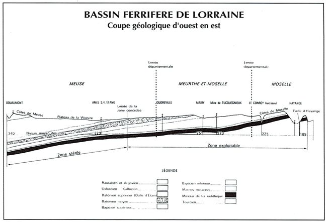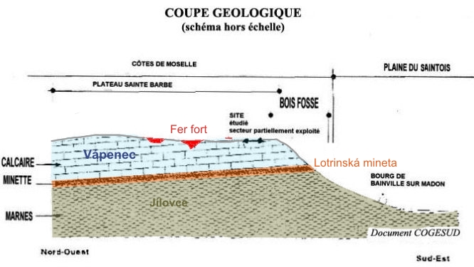 Lotrinsko je zemí stolových hor a vápencových náhorních plošin, které odrážejí vodorovné uložení mocných sedimentů jurského stáří. Fer fort, relikt po tropickém zvětrávání celé oblasti, se vyskytuje pouze na vrcholu oněch plošin, zatímco mineta je podestýlá a vychází na povrch teprve jako souvislý vodorovný pruh ve svazích kaňonů, vyhloubených místními toky, představujícími dvě hlavní vodoteče - řeky Meurthe a Moselle.