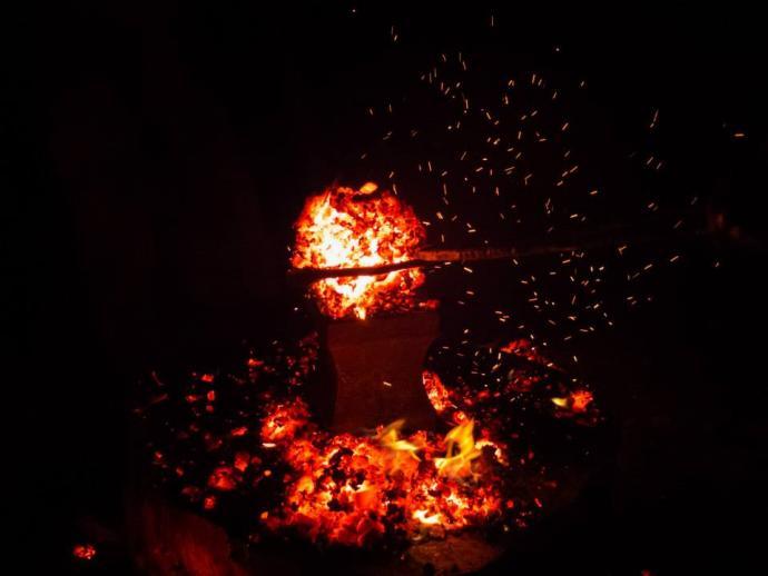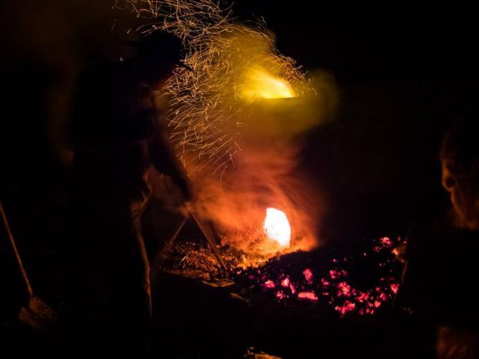 I ze zapálení milíře udělali Francouzi velkou slávu. Nejenže se jednalo o onen okamžik, kdy se areál otevřel veřejnosti, započalo oficielně první sympózium železa a celý monument byl formálně umístěn do seznamu památek UNESCO, ale rovněž samotný akt navrhli naši hostitelé poměrně pompézně: malý vrtulník dopravil na místo láhev šampaňského v rukou městské policistky. Starosta města Neuves-Maisons Jean-Paul Vinchelin, bývalý kovář, pověřený aktem zapálení, otevřel láhev useknutím hrdla nožem a milíř pokropil ve znamení jeho pokřtění. Poté teprve vhodil do nitra krále, centrálního zápalného kanálu ve středu milíře, žhavé uhlíky, čímž spustil proces hoření...