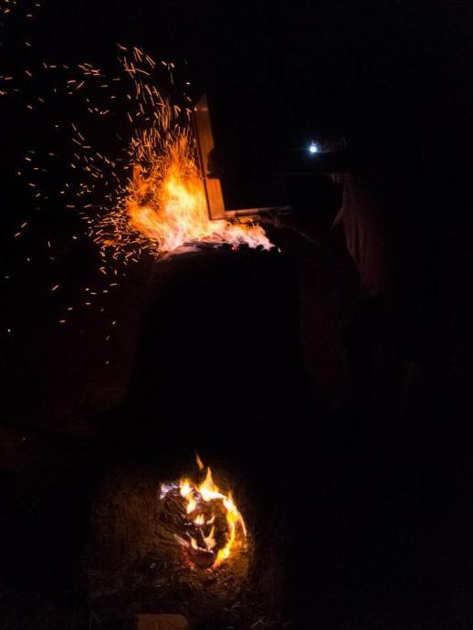 Stran obsahu slámy jsme to ovšem trochu přehnali - naše výsledná směs byla spíše špinavou slámou nežli jílem, a tak po jejím vyhoření se materiál změnil na jakýsi poměrně zpráchnivělý 'geopolystyren', sice úžasných tepelně izolačních vlastností (na hrudi pece šlo udržet ruku i při plném provozu), nicméně v případech, jako je promáčknutí hrudi naskrz při ucpávání mezery mezi ní a štítkem, tato jediná výhoda rychle pozbyla na významu. I tak vydržely všechny pece celkem bez problému každá tři tavby.