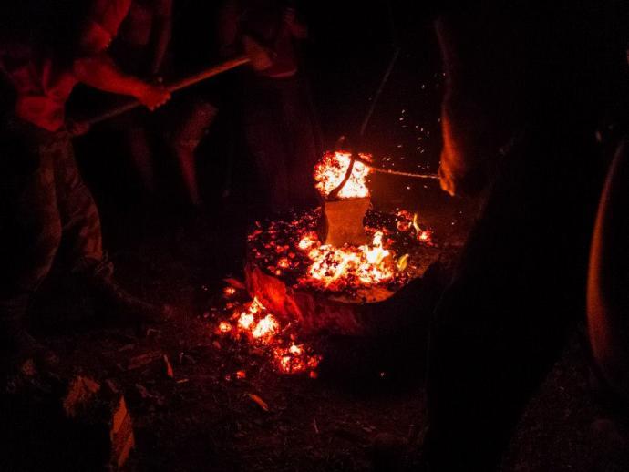Po poslouchání protivného pískání vysavače pohánějícího pec kolegy Merluzza téměř po celý týden, navíc vedoucího stran jeho konfigurace ke zbytečně chabým výsledkům (9 kg řídké houby ze 100 kg funkční rudy je prostě málo), jsme usoudili, že provedeme provokaci. Zatímco jsem s kolegou Vojtěchem rozebíral milíř, byly k jedné ze dvou z našich pecí ten den v provozu umístěny dívky. Měly jediný úkol - jako ženy dosáhnout efektivity tavby vyšší než soused, v naší malé peci ihned vedle. První samostatnou tavbu, navíc vedenou 'intuitivně', tedy pouze sledujíc projevy pece nikoliv časomíru, provedly naprosto excelentně s výtěžností 17% hustého kovu vztaženo na hmotnost původní rudy. Bohužel je zradil opět fosfor - krásná hustá houba se i přes svou kvalitu při kování beznadějně drolila. Družstvo kluků (Loki + druhý Honza), které mezitím začalo soutěžit s týmem dívek o to, kdo bude mít vyšší účinnost tavby (výsledek byl nerozhodný), po extrakci z pece vlastní hustou, ale též fosforovou houbu namísto kování raději zbaběle zchladilo v kýblu s vodou, aby zůstala zachována v celku. Tento akt dívky s jejich nyní již jen železnou drobenkou pochopitelně nadevše rozladil a urazil.